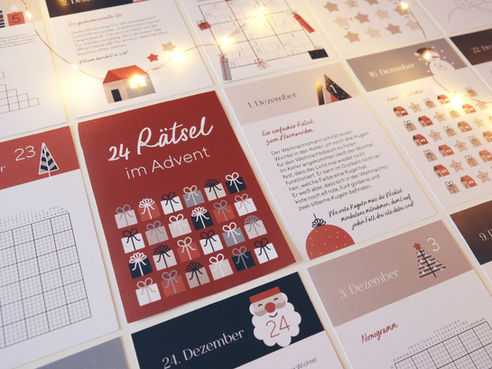 Seitdem begleitet mich diese Idee und in diesem Jahr habe ich es endlich geschafft einen eigenen Rätsel-Adventskalender zu designen. Ich wollte einen Mix aus textlichen Logikaufgaben, Zahlen- und Kreuzworträtseln und Bilderrätseln. Natürlich durfte ein weihnachtliches Design mit schönen Illustrationen nicht fehlen. Es hat mir sehr viel Spaß gemacht diesen Rätsel-Adventskalender zu designen und ich hoffe ihr habt genauso viel Spaß dabei, die Rätsel zu lösen.